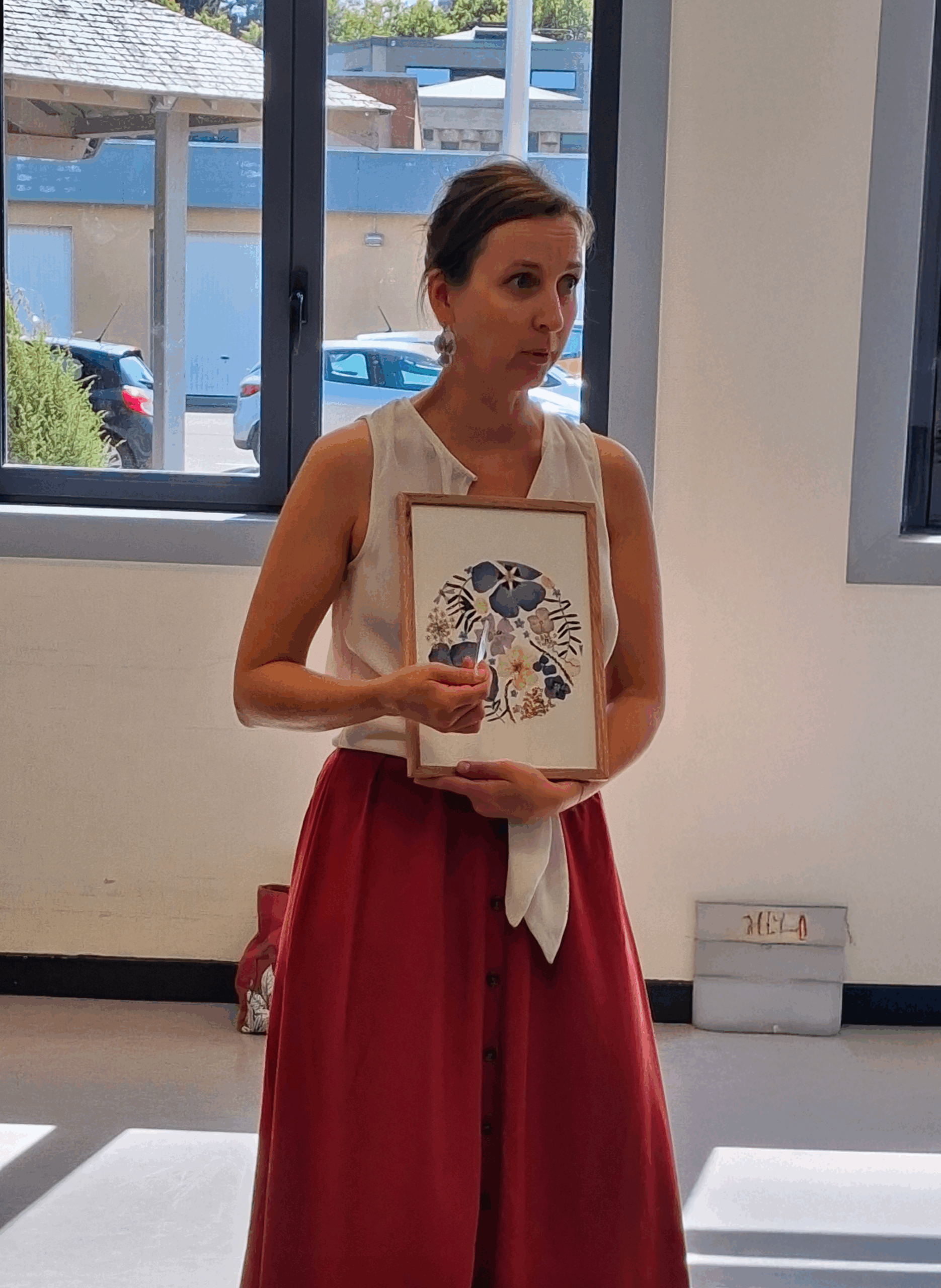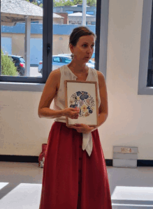 Après notre réalisation, notre animatrice nous a expliqué ses techniques de séchage et de pressage. L’épaisseur et la teneur en eau sont à considérer, les coloris se révèlent après séchage, et c’est donc la surprise, à chaque fois. Chacune est repartie, ravie, avec sa production personnelle encadrée.