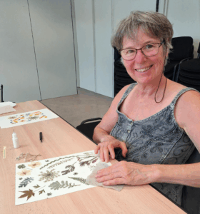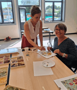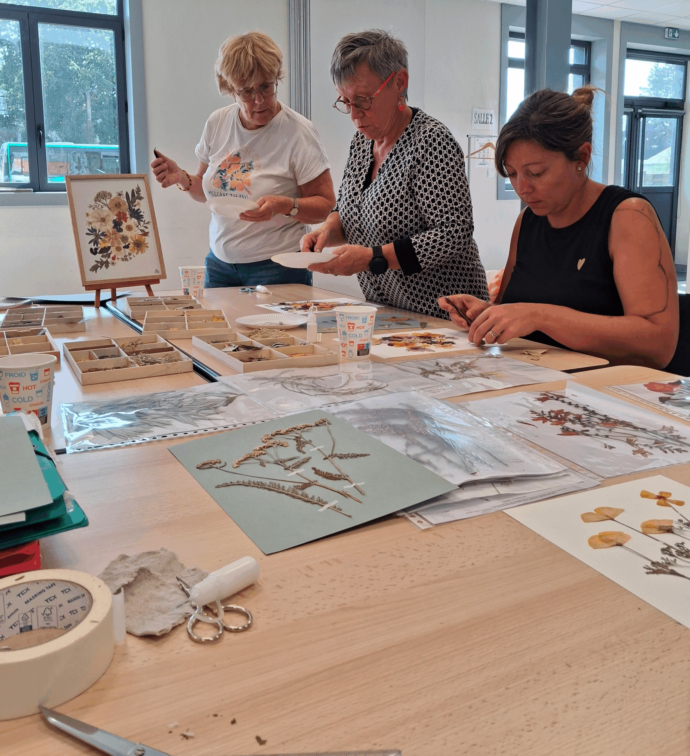 L’animatrice Yuliya Robert -créatrice d’herbiers -de la Société Inspirihome (https://inspirihome.fr) de Noyal-Chatillon-sur-seiche, nous a guidées pas à pas pendant deux heures afin de réaliser un herbier personnel décoratif ou scientifique, au choix de chacune avec des fleurs et des feuillages séchés, par ses soins.